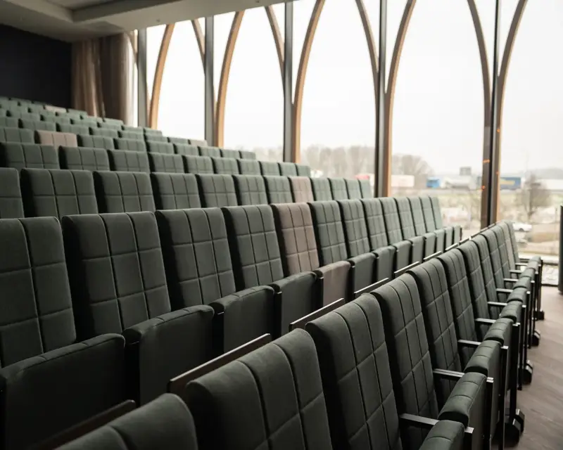 The auditorium has 126 fixed seats, each with its own table and power point for every 2 seats. It is possible to add another 14 seats on the 1st row. This offers a maximum capacity of 140 seats. The auditorium has a large projection screen and beamer. The modern equipment, lighting, blinds and air conditioning can be controlled from the auditorium. Ideal for presentations, lectures and singing performances because of the good acoustics.