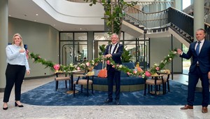 Venlo, woensdag 9 juni - De Burgemeester van Venlo, Antoin Scholten, heeft vandaag tijdens de officiële openingsceremonie het nieuwe Van der Valk Hotel Venlo geopend. Met een gouden schaar werd “een duurzaam bloemenlint” doorgeknipt samen met de directie Han en Ine van der Eijk (vierde generatie Van der Valk).