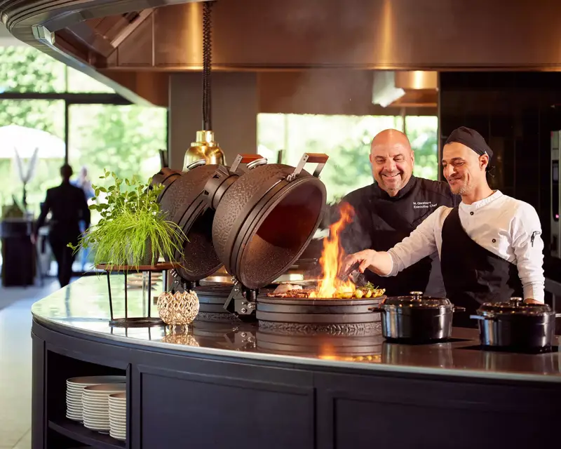 Vanuit de open keuken is het genieten van de lekkerste gerechten. Gerechten worden vers gemaakt in de keuken met de wok, grillplaat, pizza-oven en verschillende Kamado-barbecues.